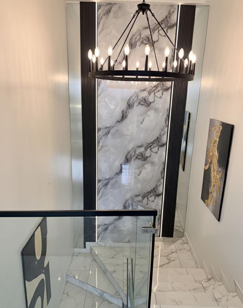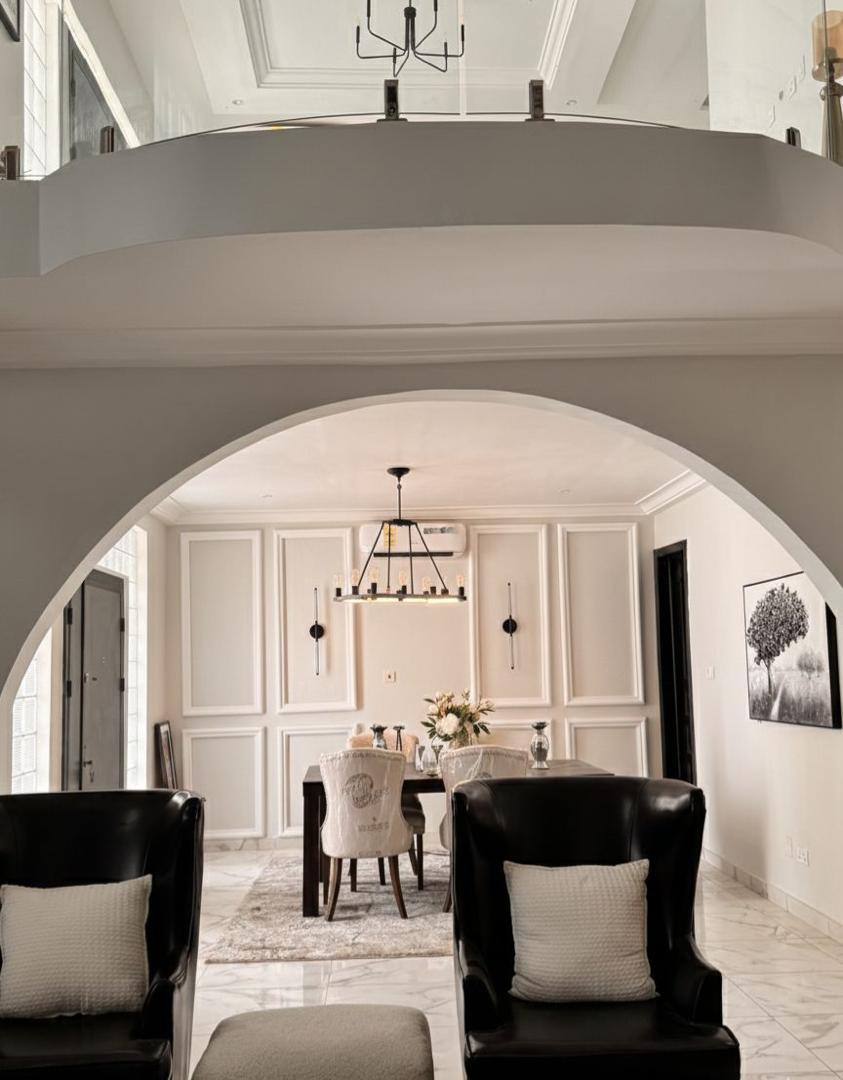 A complete luxury interior fit-out for a private duplex villa in Accra. Double-volume living room, archway-framed dining with wainscoting, marble staircase landing, master bedrooms with tufted headboards, and curated corridors throughout.